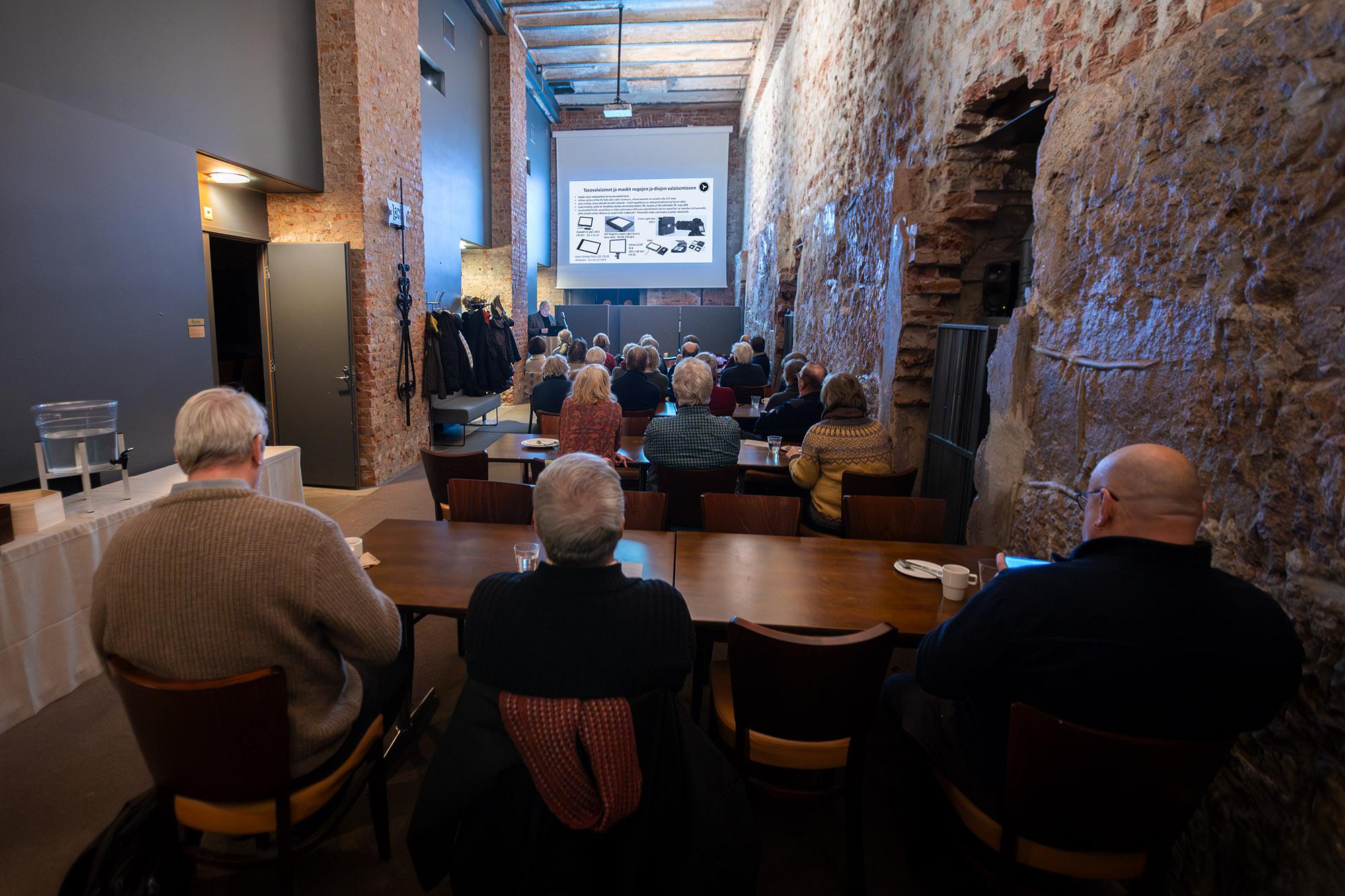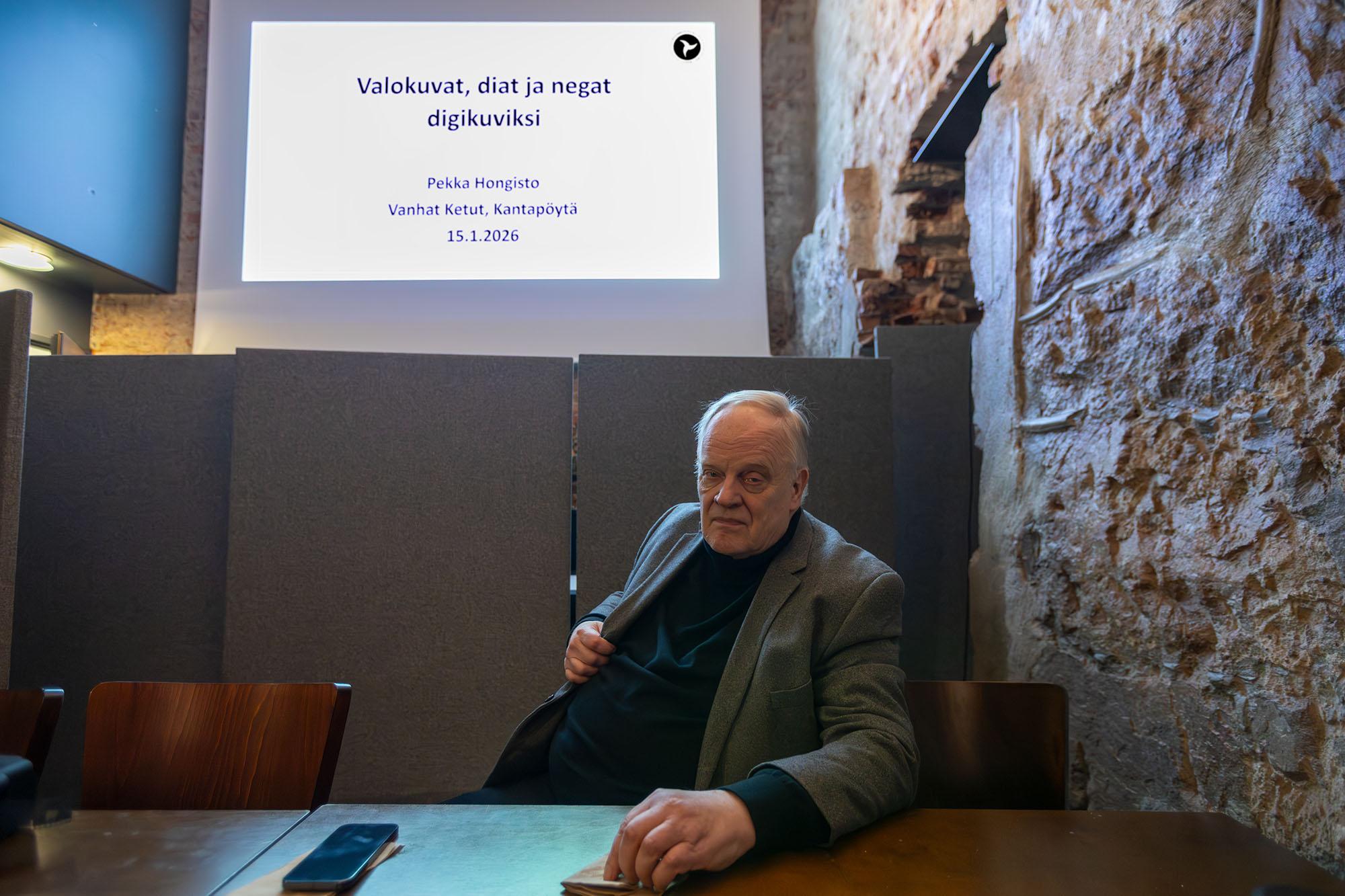Kiltakellarin lämpiöön kokoontui torstaina 15.1.2026 lumipyryisestä säästä huolimatta lähes 30 digitoinnista kiinnostunutta kuulijaa. Suomen valokuvahistoriallisen yhdistyksen (SVHY) puheenjohtaja Pekka Hongisto oli koonnut meille runsaan tietopaketin aiheesta.
