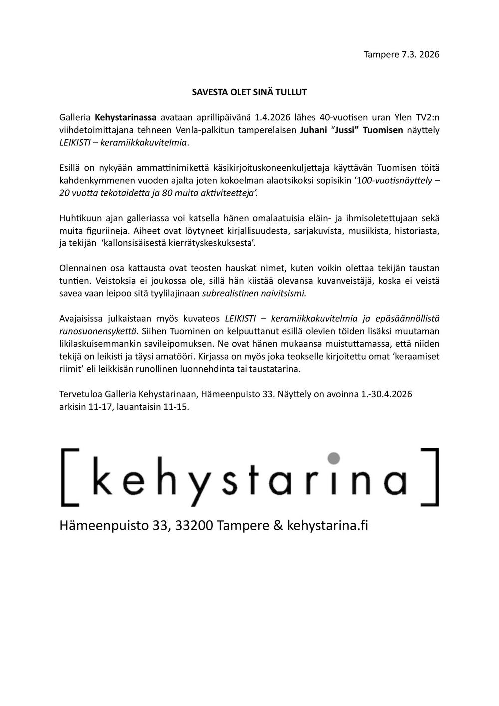 LEIKISTI -Jussi Tuomisen keramiikkanäyttely 1.-30.4.2026